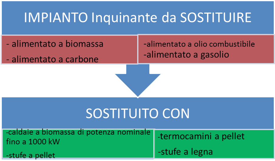 L’intervento consiste nella sostituzione di impianti di climatizzazione invernale in edifici esistenti, parti di edifici esistenti o unità immobiliari esistenti, o di riscaldamento di serre esistenti e fabbricati rurali esistenti, alimentati a biomassa, a carbone, a olio combustibile o a gasolio, con i seguenti generatori di calore: caldaie a biomassa di potenza termica nominale inferiore o uguale a 500 kWt; Per le sole aziende agricole è incentivata oltre la sostituzione, l’installazione di impianti di climatizzazione invernale dotati di generatori di calore tra quelli sopra elencati. In tali casi è consentita l’installazione anche come integrazione di un impianto esistente previa presentazione di un’asseverazione redatta da tecnico abilitato che, tenuto conto del fabbisogno energetico, ne giustifichi l’intervento.
